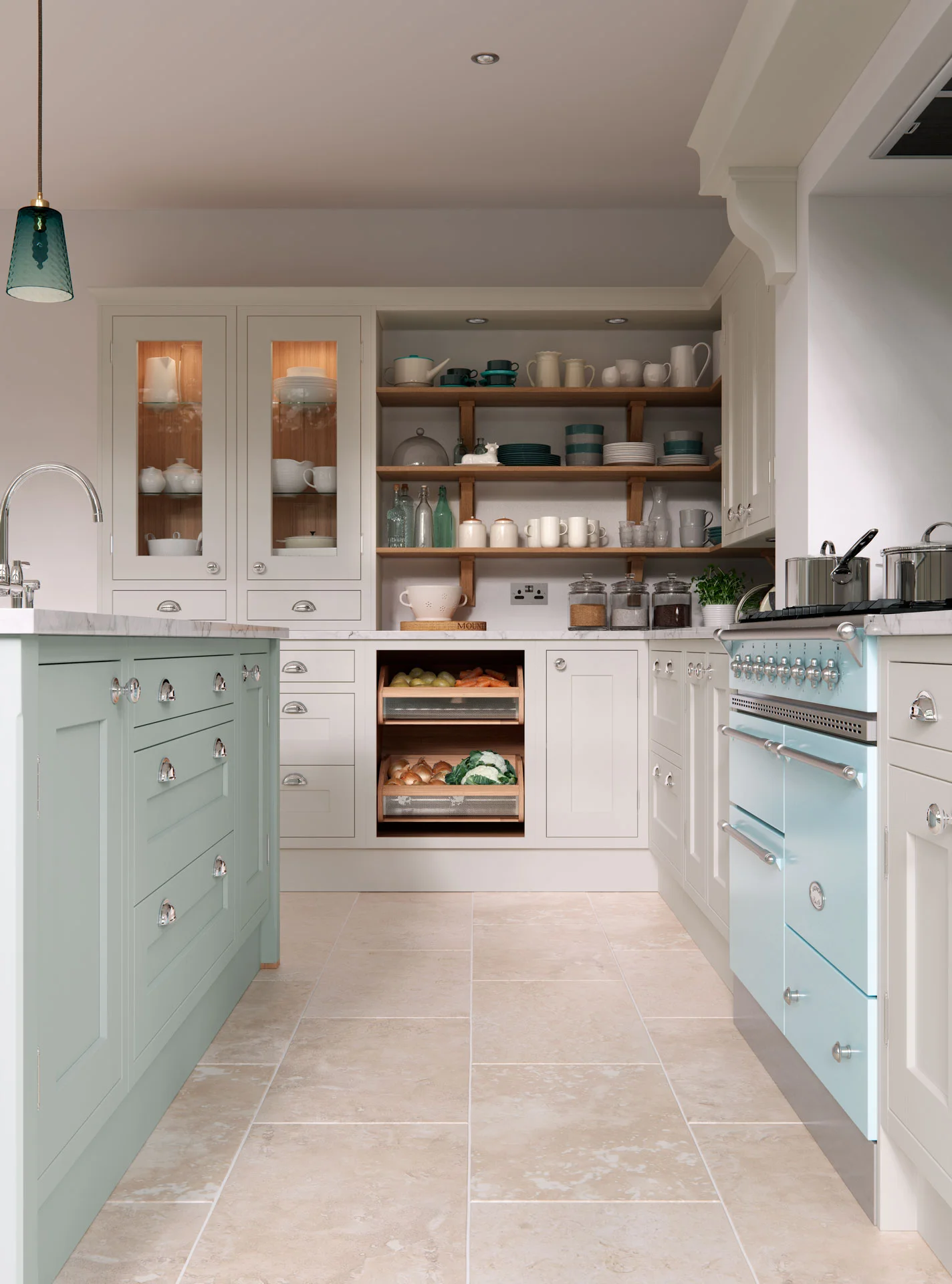 Using the modern Matt Dark Blue colour and rounded cupboards on an island bring this traditional kitchen style into the modern day. When used with a surround of traditional tiles underfoot, the island holds a solid and striking presence in this kitchen.