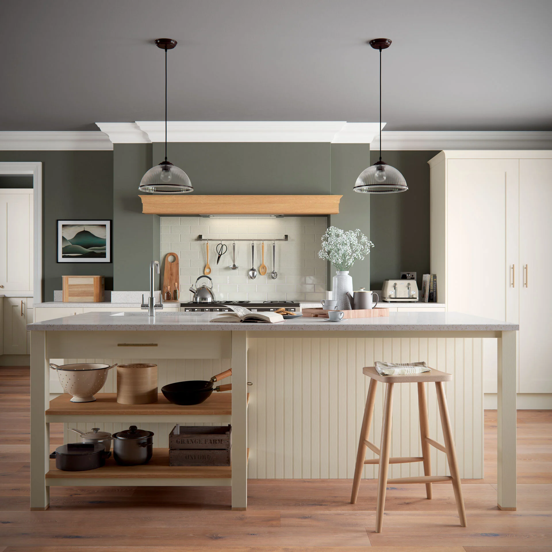 Another example of the cream, this time on the oak is used on the worktop which helps to split the wall colour with the colour of the units.