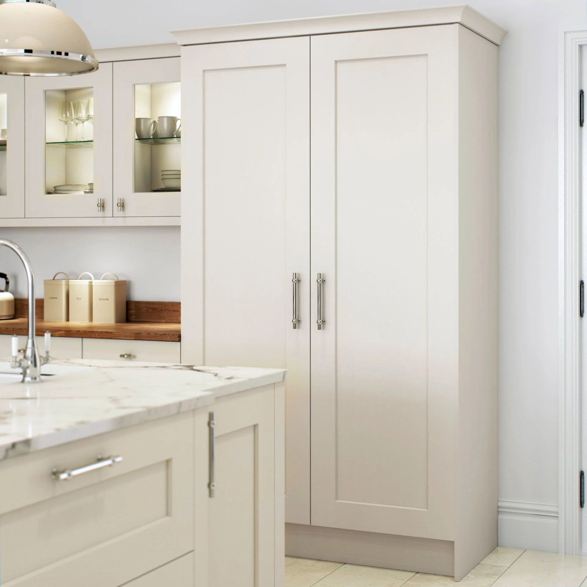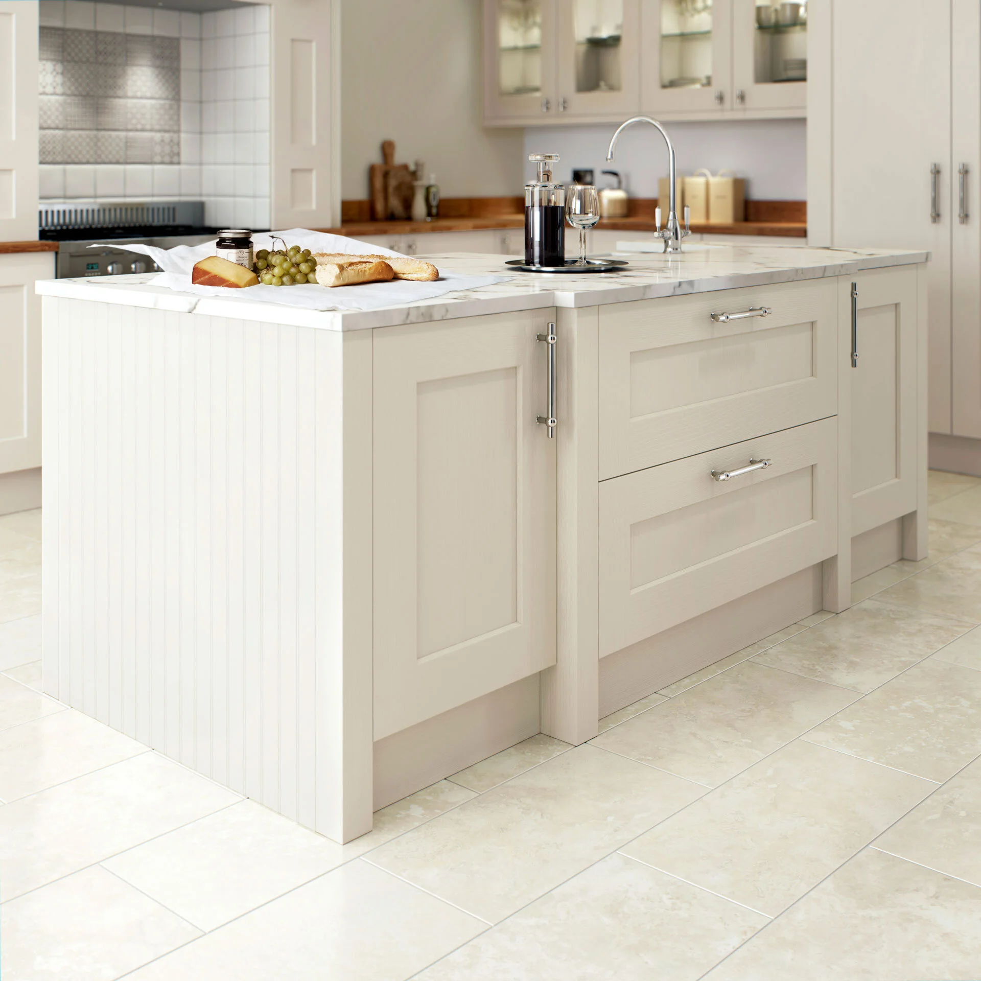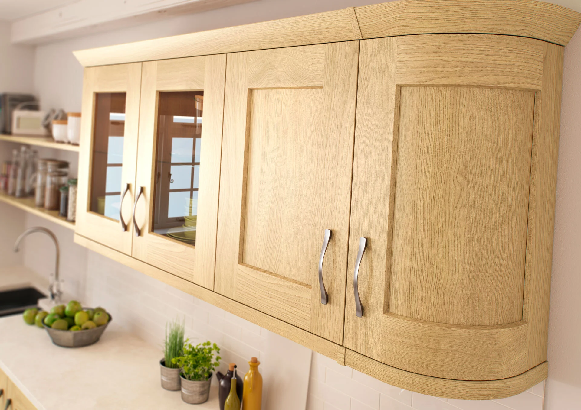 Copper handles accent this popular cream colour and an oak laminate.